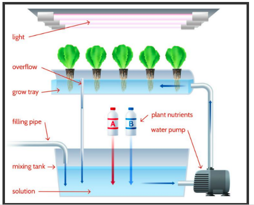 2. Film technique: plants are grown in a trough or tube having a thin film of recirculated nutrient solution.