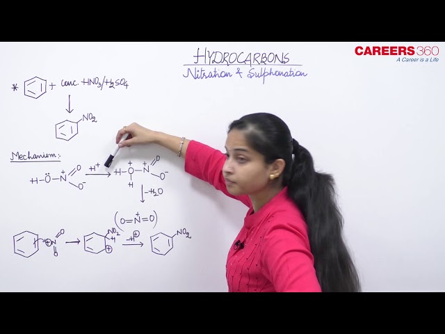 Benzene undergoes nitration when treated with concentrated nitric acid inpresence off concentrated sulphuric acid, i.e, nitrobenzene is formed. The reaction is carried at 313-323K, when one of the H atom from the benene ring is replaced by nitro group.