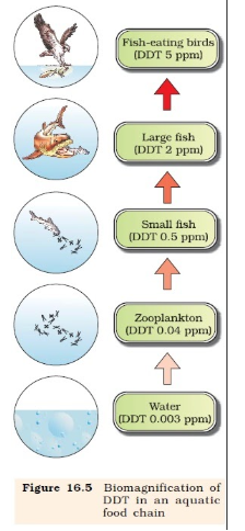In this manner, the concentration of DDT is increased at successive trophic levels; say if it starts at 0.003 ppb (ppb = parts per billion) in water, it can ultimately can reach 25 ppm (ppm = parts per million) in fish-eating birds, through biomagnification.