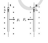 Let us take two long straight conductors carrying currents $i_{1 \text { and }} i_2$ placed parallel to each other at a distance 'a' from each other as shown in the figure -