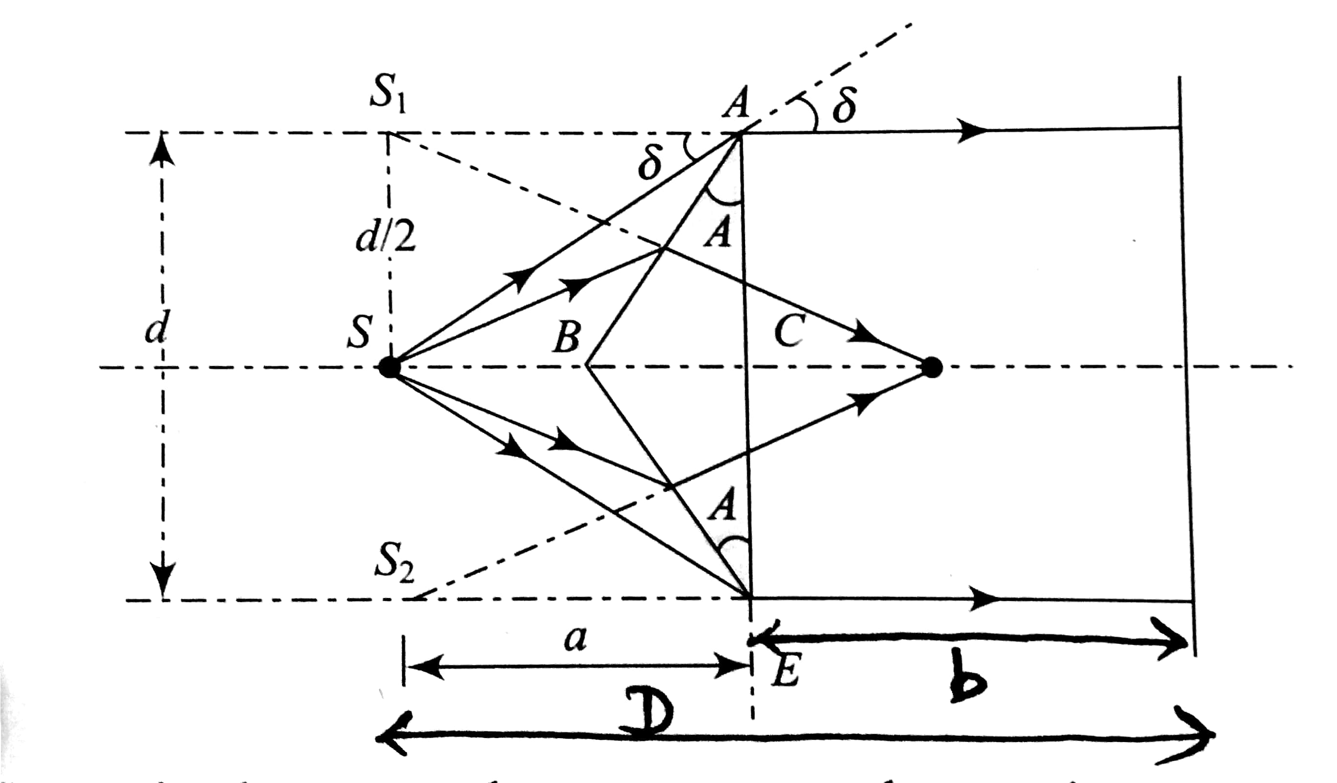 Let the separation between $S_1$ and $S_2$ be $d$ and the distance of slits and the screen from the biprism be a and b respectively i.e. $D=(a+b)$. If angle of prism is $A$ and refractive index is $\mu$ then $d=2 a(\mu-1) A$