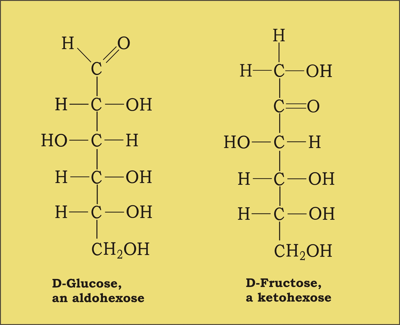 - For example, D-Glucose and D-fructose. Both have the same molecular formula as C6H12O6. But But D-fructose has a primary alcohol at C-1 and a ketone at C-2 and D-glucose has an aldehyde at C-1 and a secondary alcohol at C-2.