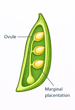 1. Marginal placentation: The placenta forms a ridge along the ventral suture of the ovary and ovules are borne on this ridge forming two rows. Placenta developing along the junction of the two margins of the carpel in one chambered ovary. E.g., pea, gram, etc.