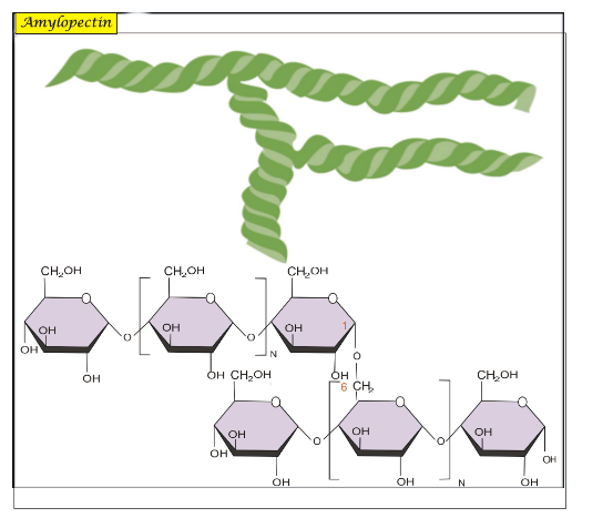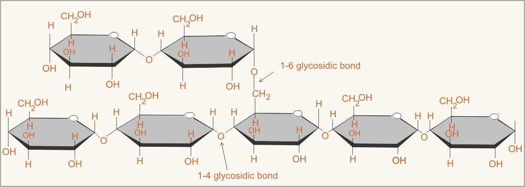 It is a homopolymer consisting of glucose monomers linked via α-1,4 glycosidic bond and branches via α-1,6 glycosidic bond at every ten or so units.
