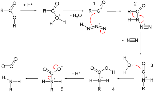 Carboxylic acid on reaction with hydrazoic acid in the presence of acid(H2SO4) gives acid azide which on heating gives alkyl isocyanate followed bu hydrolysis to give 1o amine. The reaction occurs as follows: