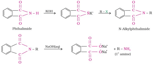 This reaction is used for the preparation of 1o aliphatic amine and 1o aromatic amine. Phthalimide on treatment with ethanolic KOH forms potassium salt of phthalimide which on heating with RX followed by either alkaline hydrolysis or hydrazinolysis with hydrazine(H2N.NH2) produces the corresponding 1o amine. 1o aromatic amine cannot be synthesised by this method because ArX does not undergo SN reaction with anion formed by phthalimide. The reaction occurs as follows: