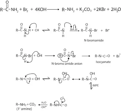 Amides on reaction with Br2 or Cl2 in alkali give 1o amine with one C atom less than the parent amide. This is known as Hofmann bromamide rearrangement or degradation reaction. The reaction occurs as follows: