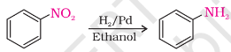 Nitro compounds are reduced to amines by reduction with metals(Fe, Sn or Zn) in dil. HCl or SnCl2 in HCl or by passing H2 gas in the presence of finely divided Ni, Pt, or Pd. Reduction with Fe scrap and HCl is preferred because the FeCl2 formed gets hydrolysed to give HCl during the reaction, and thus only a small amount of HCl is required for the initiation of the reaction. The reactions occur as follows: