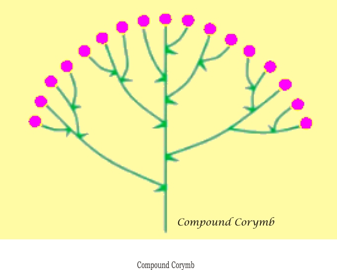 - In compound corymb, the main axis is branched and the flowers are borne on these branches, e.g., Pyrus.