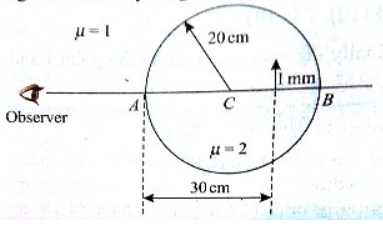 A small object is embedded in a glass spher$\mathrm{e}(\mu=1.5)$ of radius 5cm at a distance 1.5cm left of the centre. The image of the object as seen by an observer standing to the left of the sphere is at a distance: