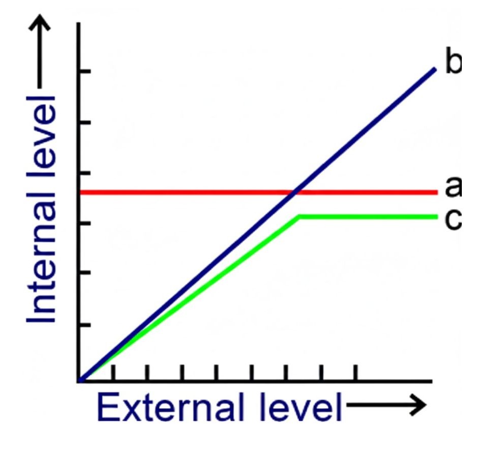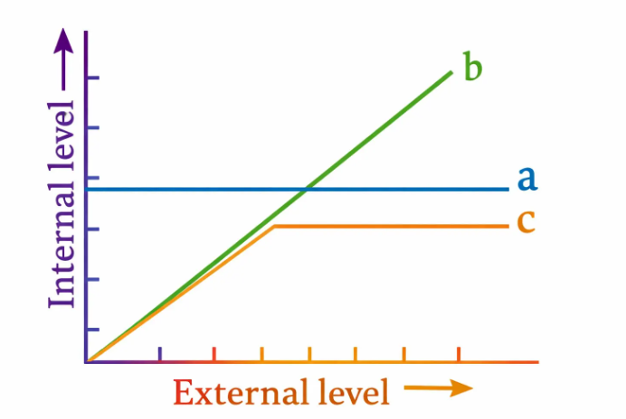 The figure given below is a diagrammatic representation of the response of organisms to abiotic factors. What do a, b, and c represent, respectively?