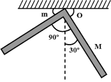 Two uniform rods of equal length but different masses are rigidly joined to form an L-shaped body, which is then pivoted about O as shown in the figure. If in equilibrium the body is in the shown in configuration, ratio of M and m will be