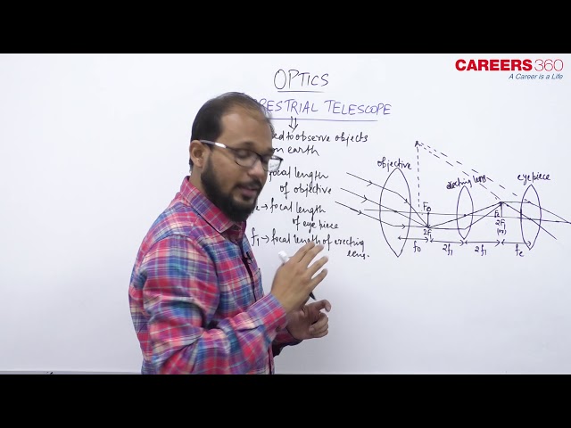 Terrestrial telescope contains three lenses as compared to the astronomical telescope. It is also known as the spyglass. As astronomical telescope forms an inverted image of the object so, the main difference between the astronomical and terrestrial telescope is the erection of the final image with respect to the object. The third lens of short focal length f is placed at 2f which forms inverted image of the object. This image serves as the object for the eye-piece. The lens placed in the center of the telescope which actually erects the image is called as the Erecting lens. The resolving power of the telescope can be given by the relations as follows: