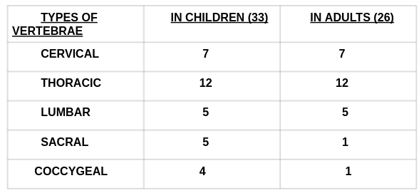 - Thus in adults the 5 Sacral are fused and 4 Coccygeal are also fused and hence the total vertebrae varies in adults and children